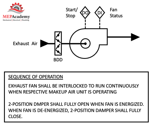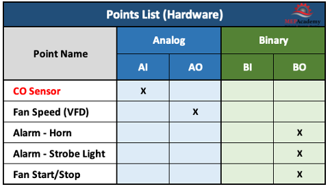 The points list is a quick reference chart that list all the input and output points required to meet the sequence of operation strategy. You’ll find these on commercial construction control drawings. Here is the one for our simple Garage Exhaust CO Monitoring Controls System.