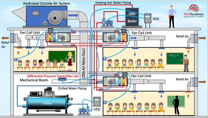 The controller will receive the input signal from the pressure sensor that the pressure has increased, and then send a message to the fan to slow down by use of a VFD, variable speed drive. The controller compares the static pressure in the main supply duct to the setpoint and then modulates the supply fan VFD to maintain that static pressure setpoint. As the demand for cooling decreases more, the static pressure setpoint can be reset downward to save additional energy. To learn more about variable speed drives see our Video on VFD’s.