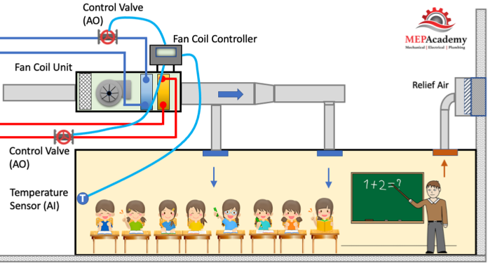 The second method would have a modulating or proportional control valve accept a varying analog signal, like 4 to 20 milliamps. Instead of two positions, full open or full closed, the valve will have various percentages of open. The analog input temperature sensor sends a signal to the fan coil controller indicating the current temperature of the space. The controller compares the current temperature in the space to the desired set point. The greater the distance from the setpoint, the greater will be the response to open the valve.