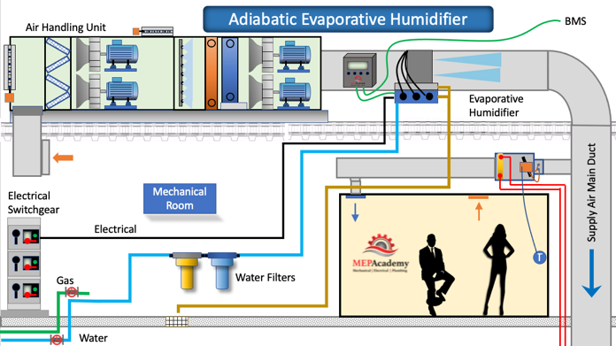 Moisture is evaporated into the air passing over the wet media, proving an increase in the water content of the air. Sensible heat from the supply air is used for evaporation of the water into vapor, this provides for cooling of the air while also adding moisture. This reduces energy consumption without the need for boilers or gas fired units that burn fossil fuels for the evaporation process.