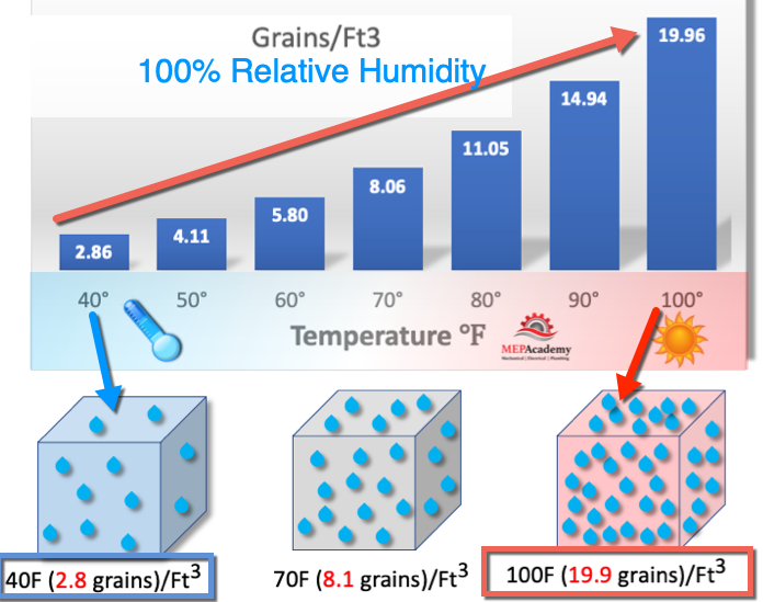 At 40F and 100% relative humidity the air can only hold 2.86 grains, but as the temperature increases, say to 70F, the air can now hold 8.06 grains/ft3 of air, and at 100F, the air holds 19.9 grains. So the warmer the air the greater its capacity to hold moisture. Keeping the relative humidity between 40% and 60% for human comfort and safety is the ideal setting.