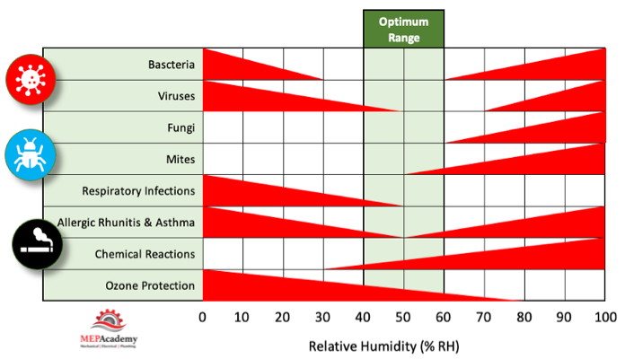 As this chart shows, bacteria and viruses love the humidity to be under 40%, or above 60%. This is where they thrive. The same for respiratory infections and Asthma. This is why controlling relative humidity is important.