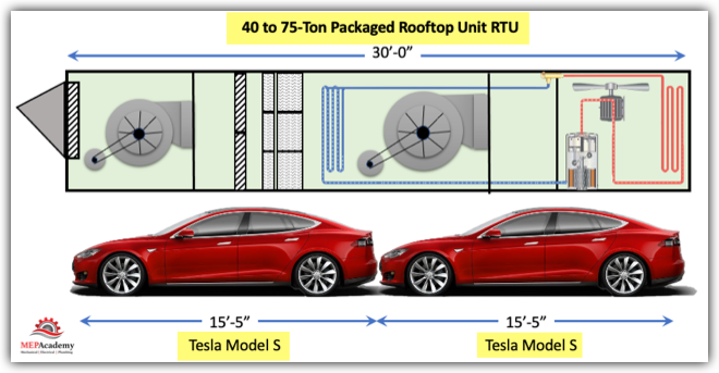 Most of us are familiar with small tonnage units from 2 to 15 tons, but how big is a 150-Ton unit. Here is a quick size comparison between a 40-Ton to 75-Ton Rooftop Unit and a 2020 Tesla Model S.