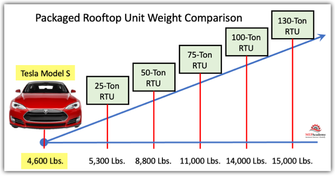 The other thing to consider is the weight of these units. So for reference here again is a quick look at a comparison based on weight. Can you guess what is heavier, a Tesla or a or a 25-Ton Rooftop Unit?