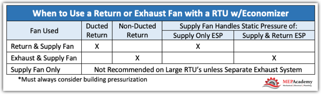 Here is an example of when to use a Return Fan versus and Exhaust Fan with an economizer.
