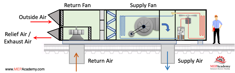 Better control of building pressure is accomplished by adding a return fan. In this configuration the return fan can handle the static pressure of the ducted return, and the supply fan can handle the supply duct static pressure. There will be three sets of dampers that control the follow and volume (CFM) of the three air streams, Outside Air, Return Air and Exhaust Air.
