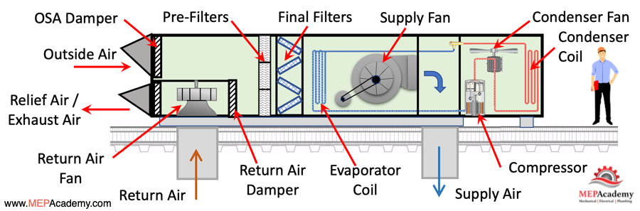 There are many types of Rooftop Units (RTU’s) including 100% Outside Air Units (DOAS), Gas/Electric, Heat Pump, Straight Cooling, VAV or constant volume. Besides how they provide heating or cooling, all other components are similar.