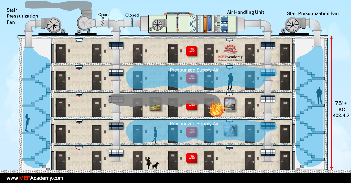 The floor above and below the fire zone is positively pressurized, while the floor with the fire is under negative pressure created by the smoke exhaust fan. There are smoke control dampers on each of the supply and exhaust ducts that are opened or closed depending on the floor or fire zone. The exhaust damper is opened only on the fire floor, and the supply dampers are opened on the floor above and below the fire floor. This is just one strategy. By venting smoke directly from these spaces, the system reduces smoke density at the fire source and improves visibility for both occupants and emergency responders.